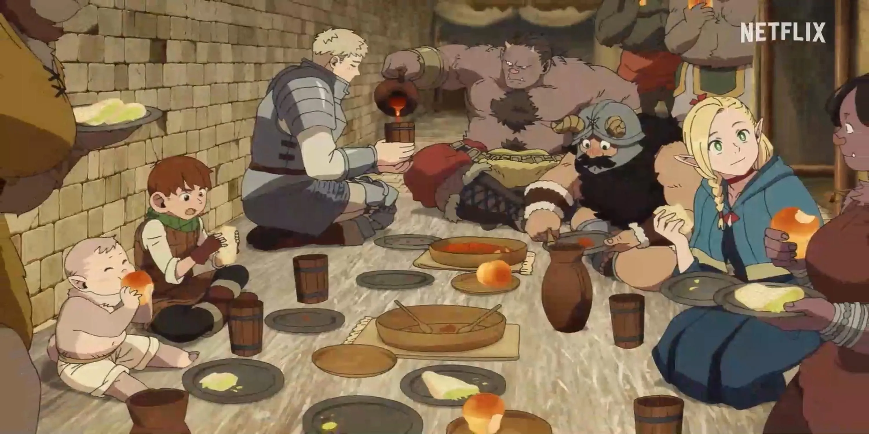 Nhóm thợ săn dungeon thưởng thức món ăn từ quái vật trong anime Delicious in Dungeon